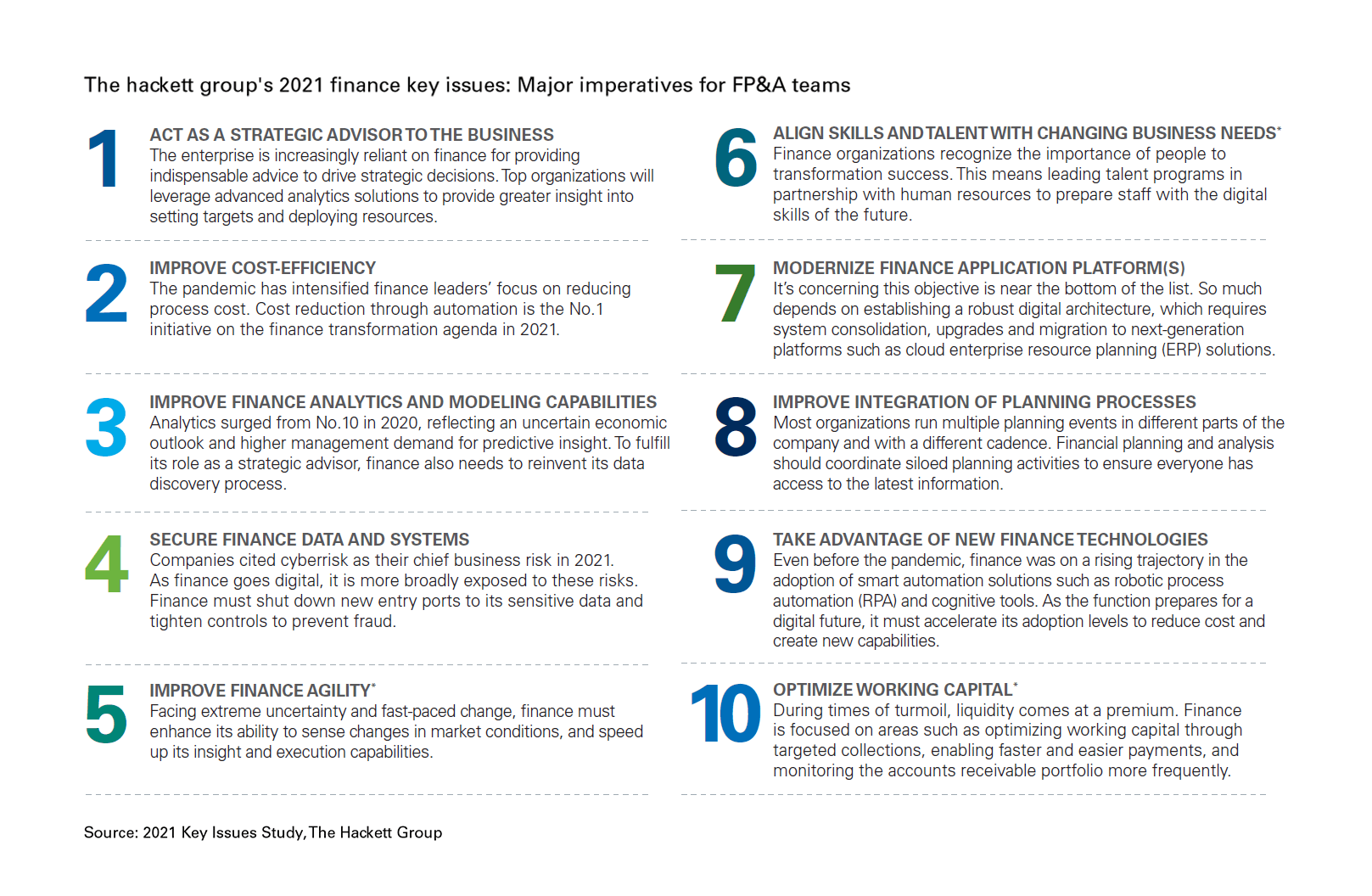 According to The Hackett Group’s 2021 Key Issues Study, finance has an ambitious agenda for 2021. Six of the Top-10 functional objectives for 2021 require strong level of involvement from FP&A teams. The problem is that on some of this most important issues, FP&A falls short of meeting today’s business needs.