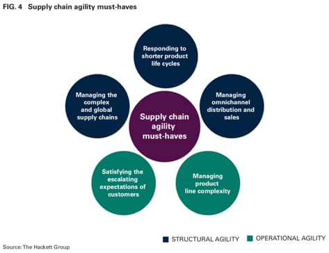 Today’s supply chain is becoming more challenging with escalating customer expectations, increasing requirements for omnichannel distribution and sales, expanding product lines, shortened product life cycles, and rising complexity in the global supply chain. The ability to effectively manage these challenges will allow an organization to be both structurally and operationally agile (Fig. 4).