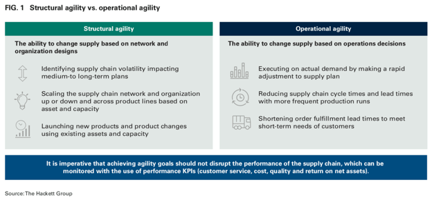 Supply chain agility can be divided into two categories: structural and operational agility. Structural agility is the ability to change supply based on the overall capabilities of the supply chain network and organization. A supply chain with structural agility is designed to scale up or down and have flexibility to manufacture or service across product lines. Operational agility is a complementary capability delivered by making decisions on how supply chain resources are scheduled and utilized (Fig. 1).