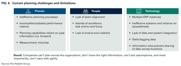 Achieving supply chain agility while mitigating the associated costs can be challenging because it requires a streamlined and collaborative process enabled with the right technology. Furthermore, organizations face limitations in their supply chain planning that exacerbate the challenges. These limitations manifest themselves in process (e.g., ineffective planning process), people (e.g., lack of team alignment and end-to-end visibility) and technology (e.g., multiple enterprise resource planning [ERP] instances, reliance on spreadsheets, and lack of data and systems) (Fig. 6). Although these challenges seem daunting, they can be overcome with the right IBP program that addresses each of these limitations and challenges.