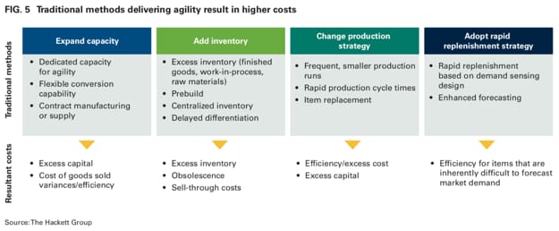 Traditionally, organizations have used different methods such as expanding capacity, adding inventory, changing production strategy and adopting a rapid replenishment strategy to deliver agility. However, these methods result in a higher cost or unfavorable cash flow for the organization (Fig. 5).