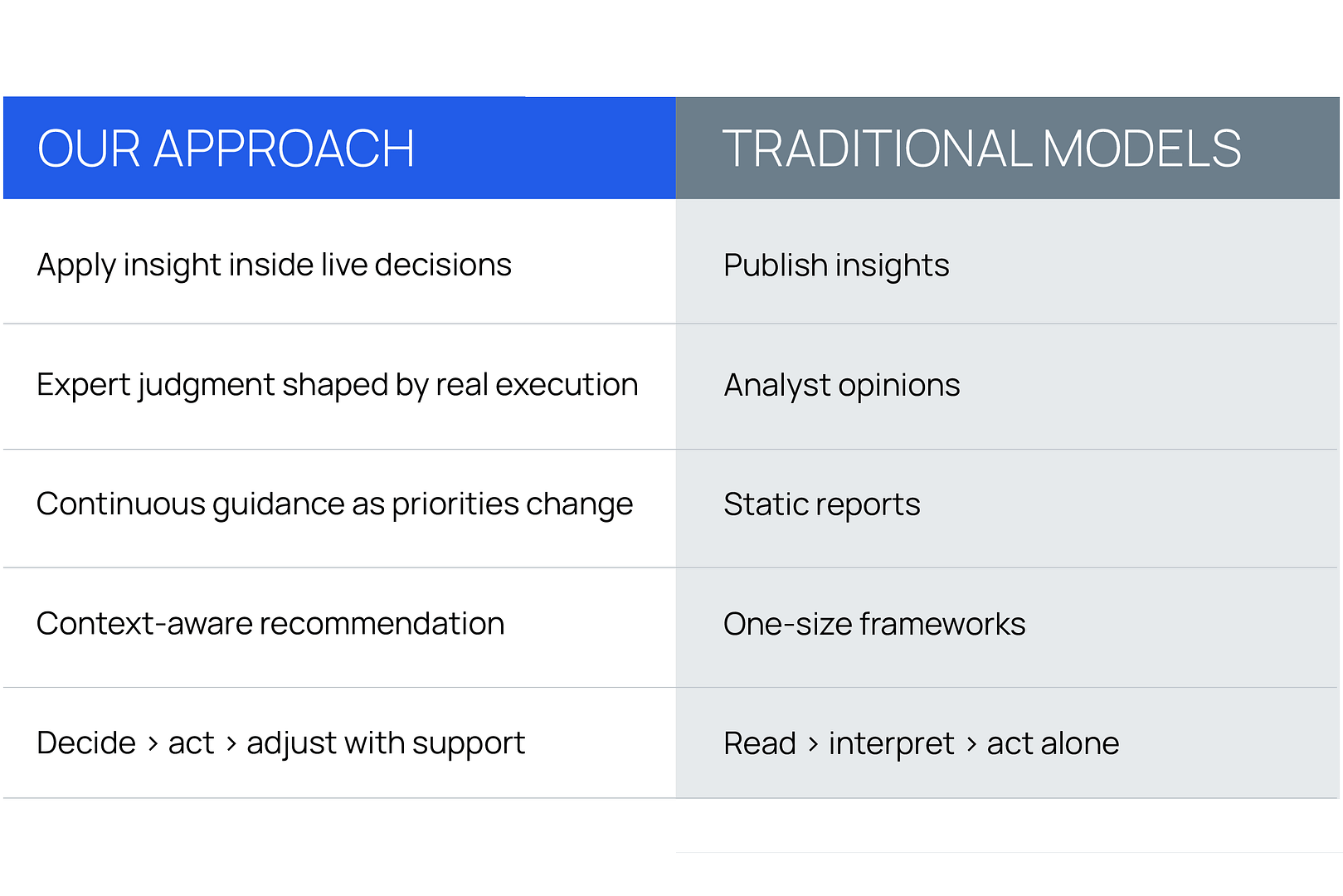 Applied Intelligence shifts the focus from consuming insight to applying it, supporting leaders inside client-specific decisions, not generic guidance.