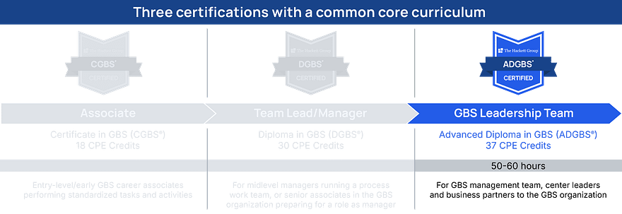 Upon successful completion of all 10 courses, students receive professional certification from The Hackett Institute and the use of the ADGBS® designation – a globally recognized professional qualification and designation for associates working in global business services and related industries. They will also receive 37 continuing professional education (CPE) credits, in accordance with the standards of the National Registry of CPE Sponsors.