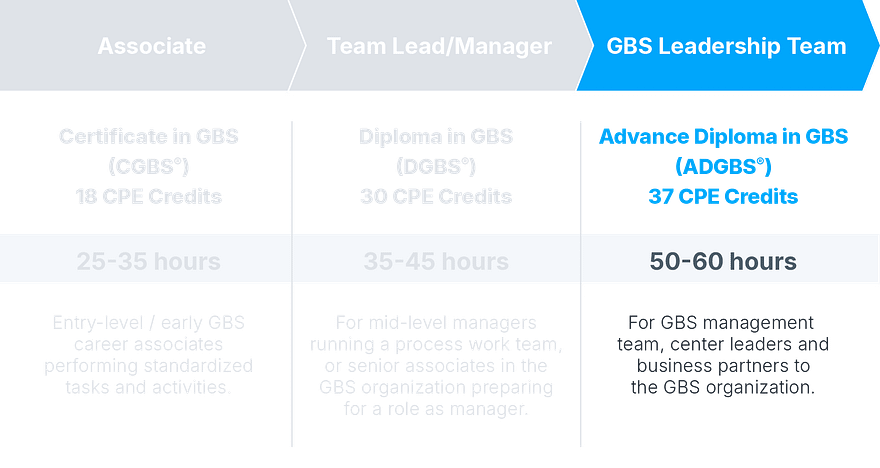 The Advanced Diploma in GBS comprises 10 courses from which you will learn and develop the knowledge and expertise to lead a GBS organization, set the strategy and mobilize a management team to drive service expansion, knowledge-centric activities and overall contribution to the enterprise.