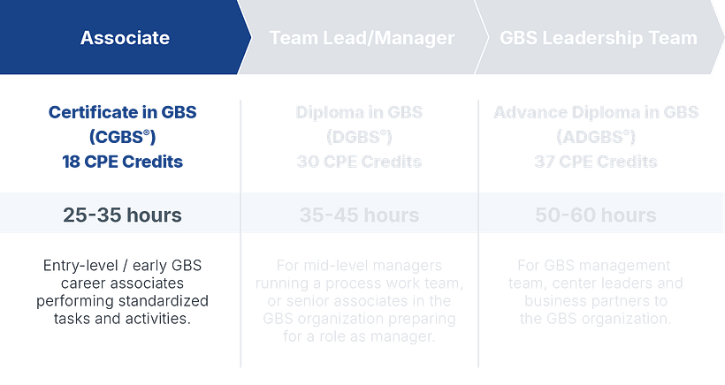 The result is a broad perspective and set of skills relevant to increasingly integrated GBS operations and the future of work. Associates will feel confident that they have a full understanding of the GBS concept, and the models, governance, processes and performance measures needed to make their GBS organization a success.