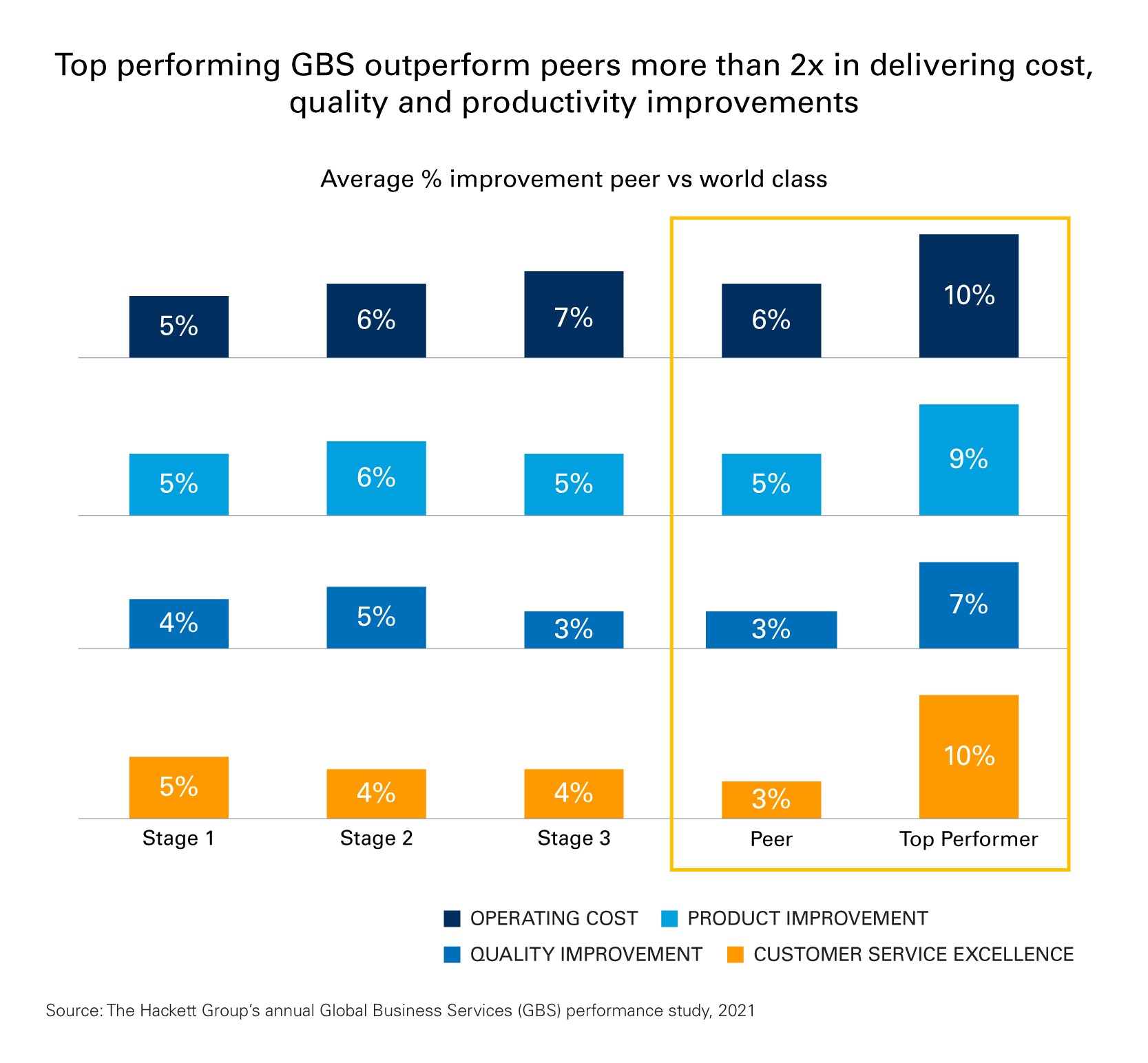 According to our latest research, world-class GBS (global business services) organizations outperform the peer group across the board in terms of percentage improvements over the past 12 months, with the greatest gains in the area of customer service excellence.