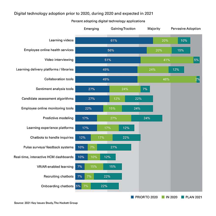 The Hackett Group’s study of HR priorities and plans for 2021 delves into adoption of a wide variety of applications of digital technology. These encompass a broad cross-section of important tools now available to HR organizations. It is widely believed that the coronavirus pandemic, and the switch to digital business models and working from home that it triggered, accelerated HR’s adoption of digital technologies by years. Our study data confirms this and presents a snapshot of the scale and scope of HR’s embrace of digital technologies before and during the pandemic, as well as projections for 2021.