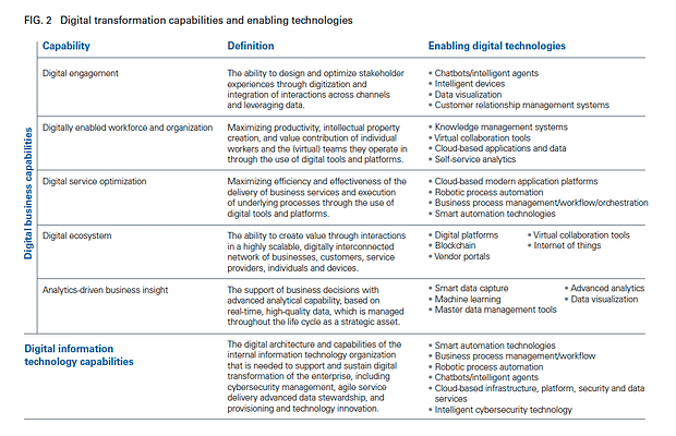 Too often, what are called digital transformations are actually made up of a series of isolated implementations of automation, analytics, cloud-based services and other technologies. These lack an overall game plan and suffer from spotty resource commitments. But world-class IT leaders address people, process and the technology landscape holistically to create and accelerate digital capabilities. We define these in the table below, along with their primary enabling technologies.