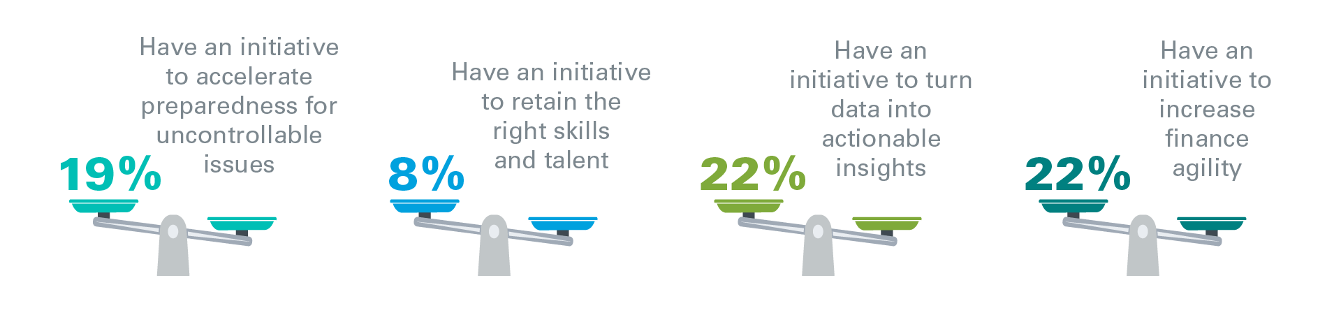 For example, while retaining the right skills and talent is a top 10 objective, only 8% of finance organizations have a major 2023 initiative planned to address this. This is particularly notable given that only 40% of finance executives expressed high confidence in their ability to meet this objective in 2023 –lowest among the 2023 top 10 objectives. Additionally, talent issues rank among the top hurdles to implementing finance transformation in 2023. Failing to address skills and talent now can have long-term implications.