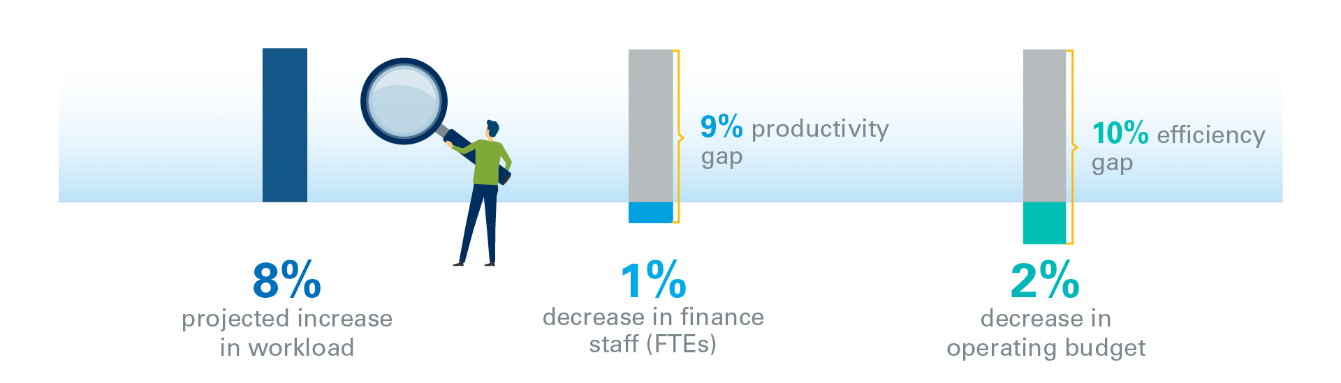 Addressing these diverse priorities will require resources and transformational expertise. The Key Issues Study confirms and quantifies what finance executives already know: They must find a way to do more with less. In 2023, the finance workload is predicted to increase by 8%, but head count and operating budget will drop slightly. This creates a productivity gap of 9% and an efficiency gap of 10%. These gaps have grown significantly from last year’s study – when the gaps were 5.3% and 5.4%, respectively. Finance executives must be prepared to address them head on.