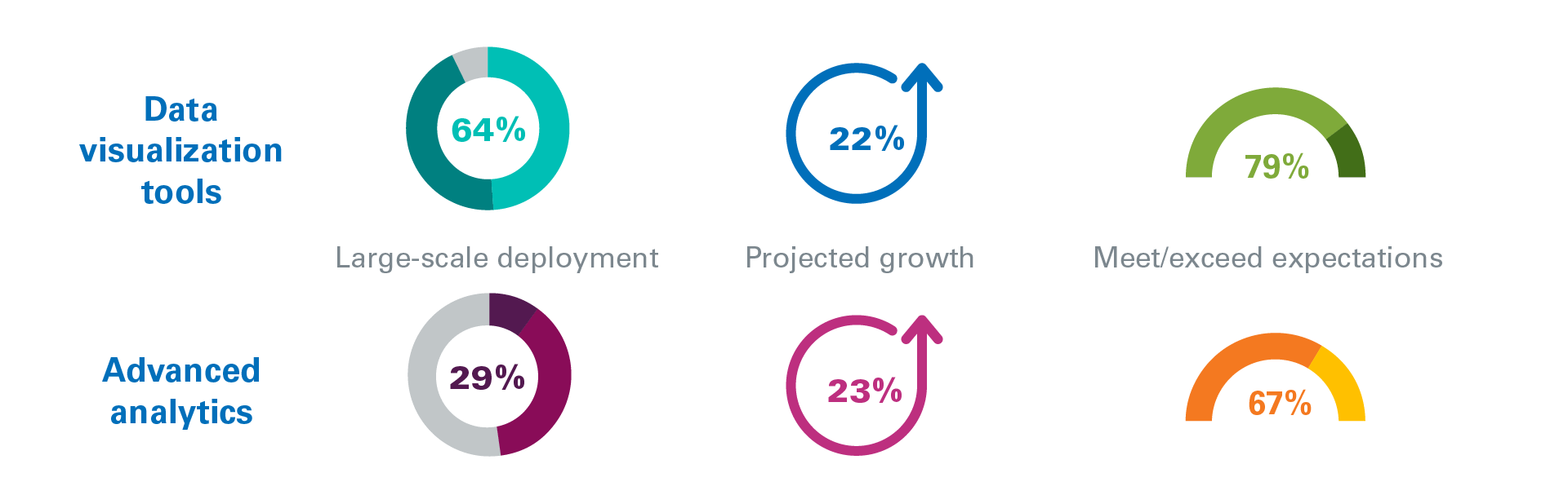 Finance must secure data and harness it into meaningful and actionable business insight that is complete and timely. Here again, finance leaders should focus on elevating these initiatives past the pilot stage or small deployments, particularly given that data-related technologies meet or exceed business objectives most of the time. This is particularly true for advanced analytics.