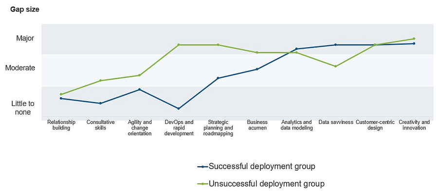 Respondents whose deployments fell short face a more debilitating lack of critical IT talent and larger skill gaps compared to respondents with successful digital deployments. We’re talking digital-era skills such as experience with advanced analytics and other emerging technologies, but also core capabilities such as process redesign, strategic road-mapping and rapid applications development technique (see diagram below). The latter two skills are ones in which the fallen-short group have the biggest gaps compared to other respondents. However, the fallen-short suffer larger gaps across most to the critical skills, indicating that talent level is broadly associated with digital deployment success.