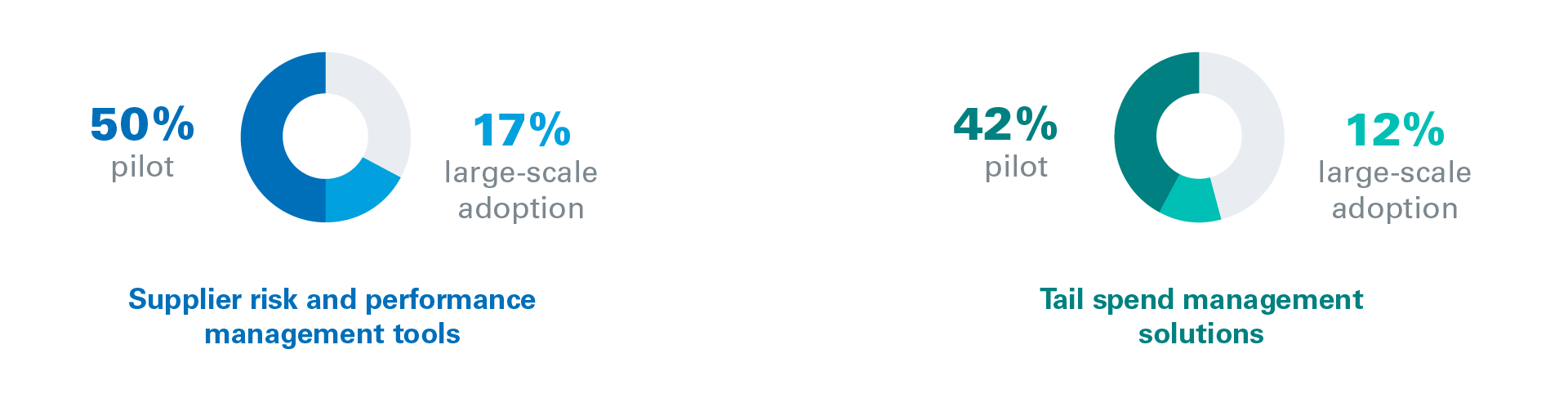 Procurement teams are starting to move beyond the core to implement functionality to support supplier life cycle management, as well as other supporting and emerging technologies. While large-scale deployment of these technologies is still limited, with product pipelines and savings dashboards being the highest at 49%, there is an exciting level of piloting for supplier risk and performance management tools, as well as tail spend management solutions.