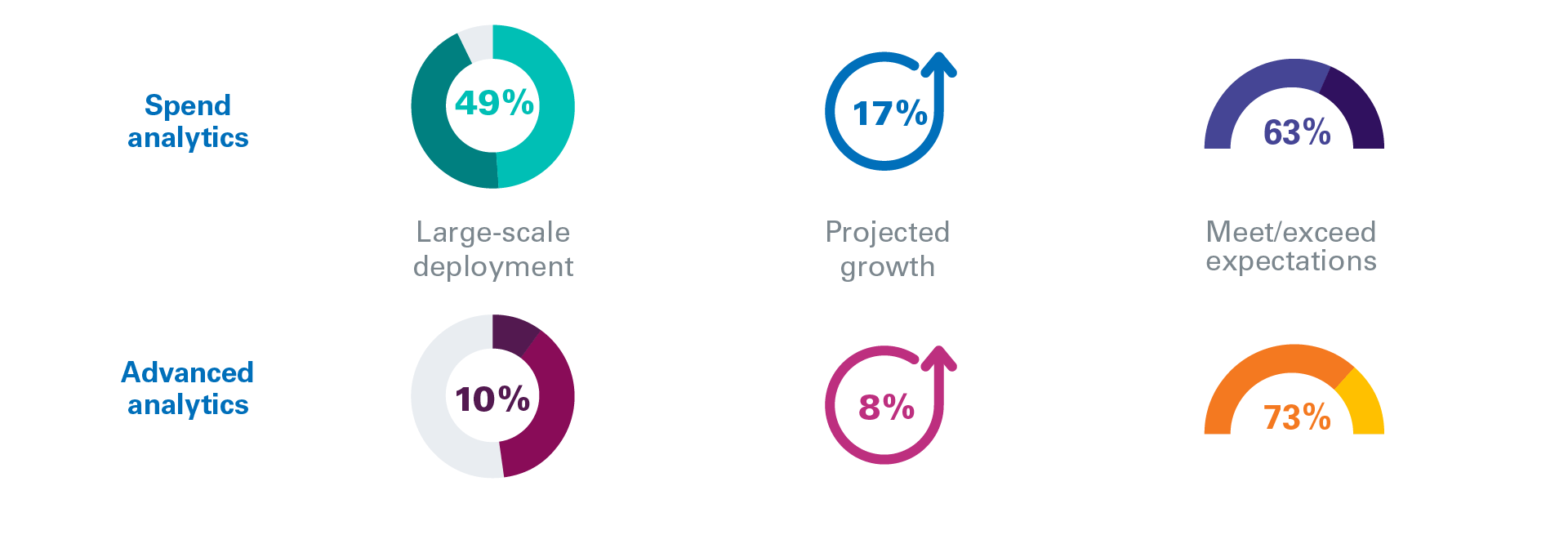 On the other hand, procurement remains slow to adopt advanced analytics – even though organizations that have adopted advanced analytics are largely satisfied with their ability to deliver on business objectives. Only 10% of companies surveyed have large-scale deployments, and about one-third have pilots in place. Projected growth in adoption lags many other technologies.