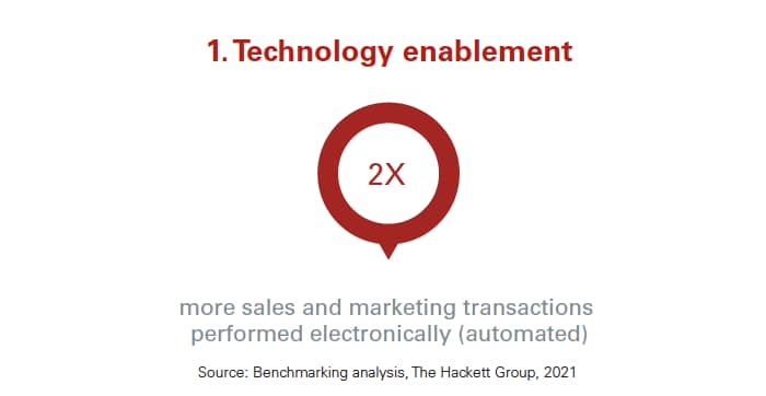 These organizations have also made substantial inroads in automating knowledge processes, freeing up staff capacity to perform value-adding work and building a strong data architecture to enable insight generation and self-service reporting and analysis. For example, 77% of Digital World Class technology organizations provide automatic generation and distribution of sales reports and the ability to run ad hoc reporting and analysis, compared to just 50% of peers. They also have a more robust data foundation as part of their modernized digital architecture: 78% of Digital World Class functions have a central data repository to generate business performance reports, versus only one-half of peers.