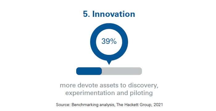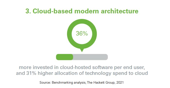 They have one-third more of their applications hosted in the cloud, compared to peers. They also invest 36% more on software-as-a-service – a significant shift that improves the function’s agility and responsiveness, and enhances business resiliency in the event of another pandemic-type disruption.