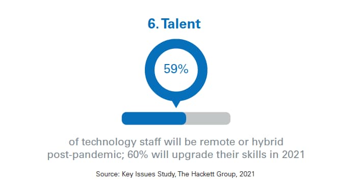 With many processes becoming more technology-enabled or migrating to digital operations centers, leading technology organizations are rebalancing their workforce with more customer-facing, partner-ready, change-oriented talent. It comes as no surprise that the largest skill gaps (i.e., the difference between demand and supply) are associated with emerging technologies such as artificial intelligence. However, the skill CIOs say they need most among staff is change leadership – the third widest of all the skill gaps predicted for 2021. Besides staff who can lead and sustain change, success going forward will also depend on having more information technology (IT) managers who can think strategically and design customer-centric solutions. Organizations that have successfully closed or shrunk gaps in these skills demonstrate an average of a 35% higher success rate in achieving goals, including enterprise digital transformation and enabling customer-facing strategies and initiatives.