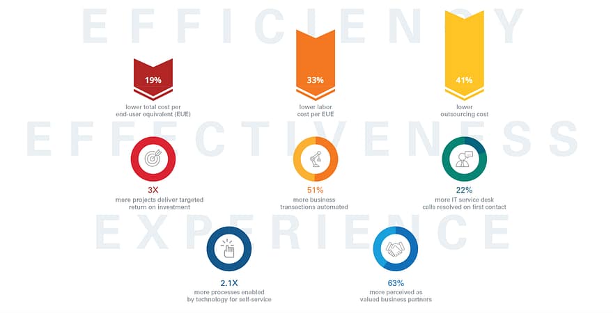 At the same time they are enabling enterprise transformation, 2021 Digital World Class technology organizations operate at 19% lower cost per end user than peers. This is remarkable because the Digital World Class organization spends an average of 3% more on technology than peers.