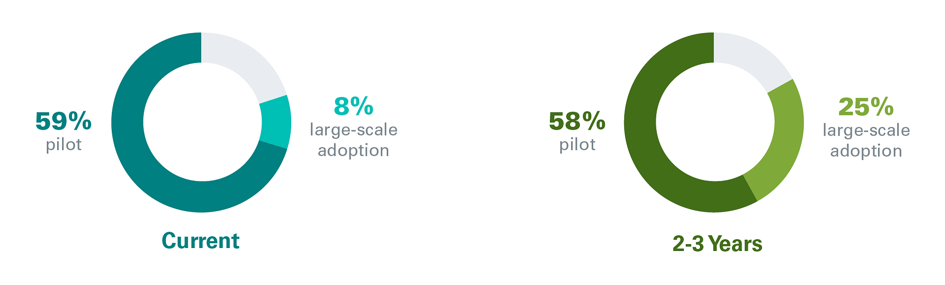 One-half of supply chain organizations have a 2023 initiative planned to roll out data management/analytics technologies. While supply chain intelligence/analytics remain primarily in the pilot stage, large-scale deployment will triple in the next two to three years.