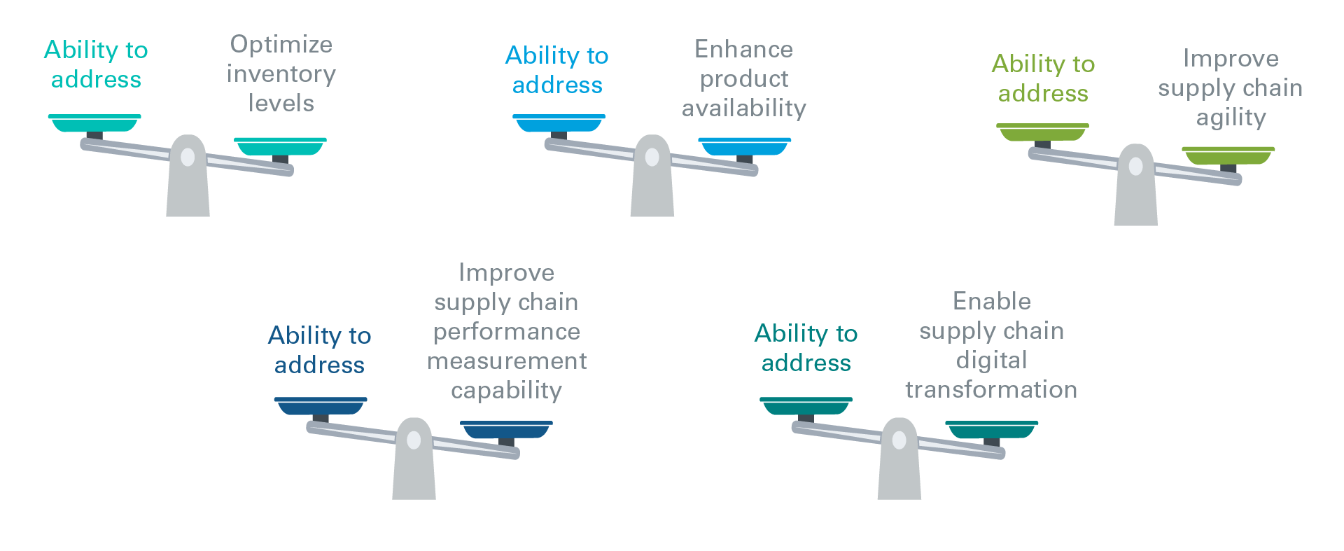 Rounding out the top five priorities for 2023 are enhancing product availability, improving supply chain cost-efficiency, and improving sales and operations planning/integrated business planning (S&OP/IBP) capabilities. Meeting these three objectives is interdependent with the top two – optimizing inventory and reducing supply risk – and will require having a cost-effective, resilient supply chain driven by strong planning capabilities that can ensure supply continuity, while responding to demand optics and supply chain disruptions in 2023.