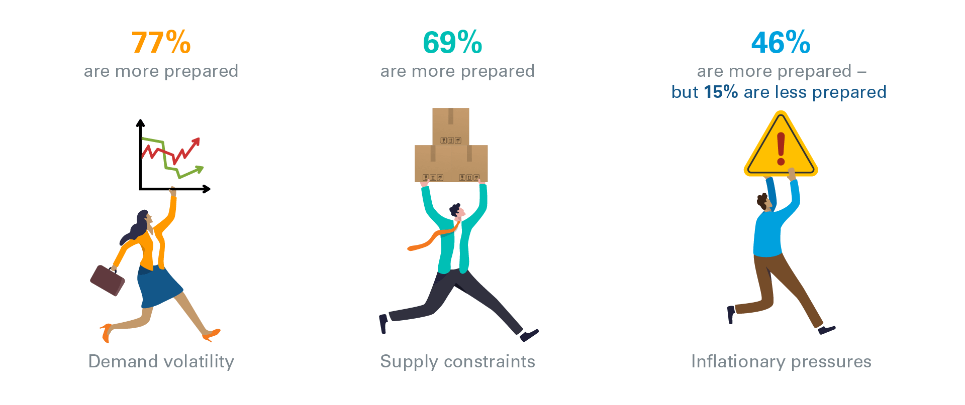 Supply chains’ ability to be resilient – that is, respond/recover quickly and cost-effectively from unexpected events – will continue to be tested. Supply chain leaders feel better prepared to address demand volatility and supply constraints, but less so for economic pressures, climate disasters and geopolitical unrest. While nearly one-half of respondents believe they are better prepared to address inflationary pressures, a significant percentage feels otherwise.