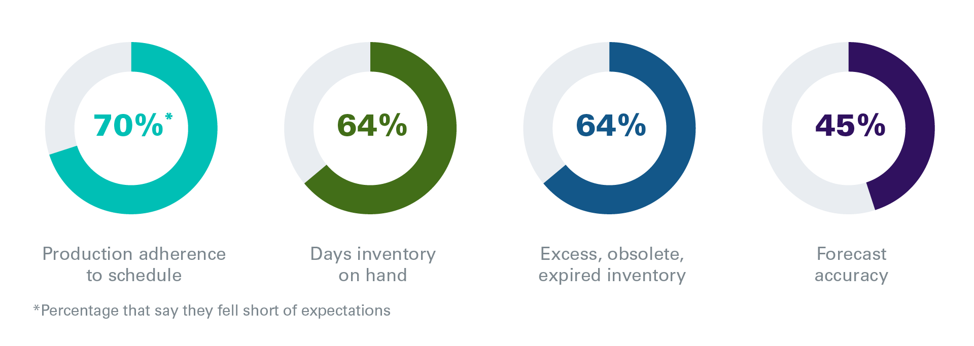 Notably, these four key metrics fell short of expectations a significant portion of the time. All of these metrics are typically part of a balanced scorecard for measuring the effectiveness of S&OP/IBP, which underscores the renewed focus on supply chain planning capabilities.