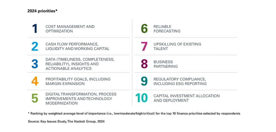 Expectations have never been higher for finance teams. In the face of continuing economic uncertainty – coupled with new and ongoing geopolitical events – finance teams are feeling increased pressure from business stakeholders. As experts predict a stall or slowdown for global economic growth in 2024, our findings from The Hackett Group’s 2024 Key Issues Study indicate that finance leaders have shifted their priorities for this year.