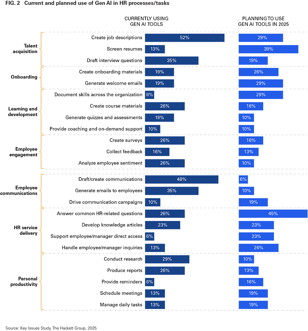 HR’s use of Gen AI is evolving rapidly. Currently, the most common applications for AI within HR include: