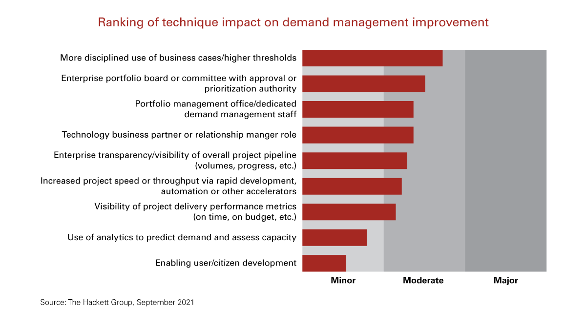 For example, governance sets the standards by which proposals are evaluated. That standard, we all hear repeatedly, should be first and foremost business value (and regulatory and security requirements of course). Yet, as shown in the graph below, value-based governance has only a moderate impact on improving demand management (albeit it tops all other tactics on the list).
