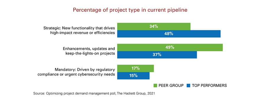 It’s not just numbers that boost improved outcomes, it’s the quality and nature of the projects. Top performers have fewer enhancement-type projects to contend with, and more projects that are strategic in nature – 41% more according to the poll (see figure below).
