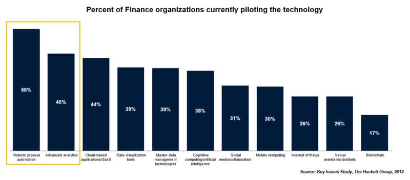 Finance needs to build a better business case to justify a bigger budget. The first thing it needs to do is understand – and communicate — the value proposition of digitization. This is often easier to say than do. Increasingly, finance is piloting technologies that not only help make processes more efficient and less costly; it’s also testing tools that augment its effectiveness in delivering better customer service. The chart below captures the percentage of finance organizations piloting specific technologies. Robotics and advanced analytics are in the lead.