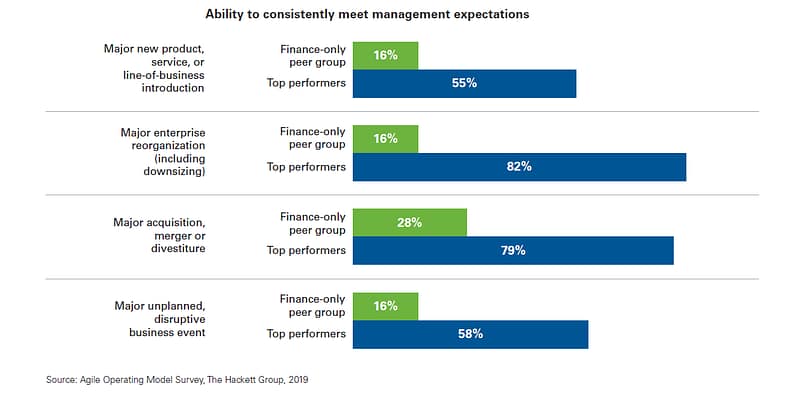 The rapid spread of Covid-19 is forcing companies to make and execute decisions at record speed. Finance must be as agile as possible to support the C-suite in this unprecedented period of uncertainty. However, our data shows that only 16% of finance organizations meet management expectations regarding their response to disruptive or unforeseen major events (see graph below).