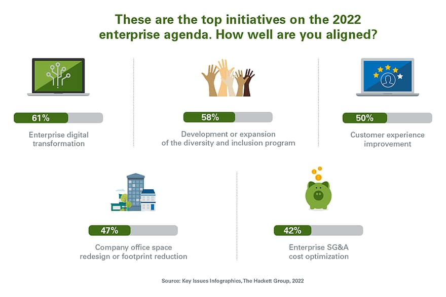 The backdrop of disruption and rapidly evolving business conditions clearly influenced HR executives’ 2022 priorities ¬– illustrated in the image below. On 2022 HR agenda, seven of the 10 top HR priorities represent human capital business and enterprise goals, indicating a strong focus by HR organizations on their role in enabling the success of the overall enterprise.