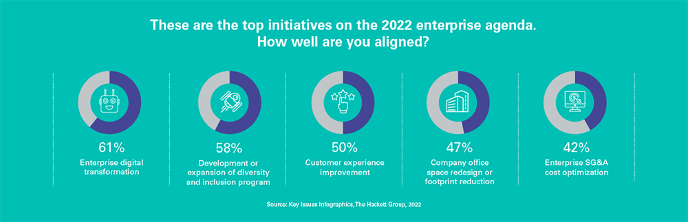 Enterprise digital transformation remains the No. 1 priority, with 61% of companies having a major initiative on the 2022 agenda – up from 53% the previous year. In the face of talent challenges, companies have also stepped up their focus on diversity and inclusion initiatives. More than one-half – 58% – now have such initiatives, compared to just 35% two years ago. On the other hand, sales, general, and administrative (SG&A) cost optimization dropped further down the ranking – from third place in 2021 to fifth place in 2022. This is consistent with an observed shift in focus from margin preservation to growth.