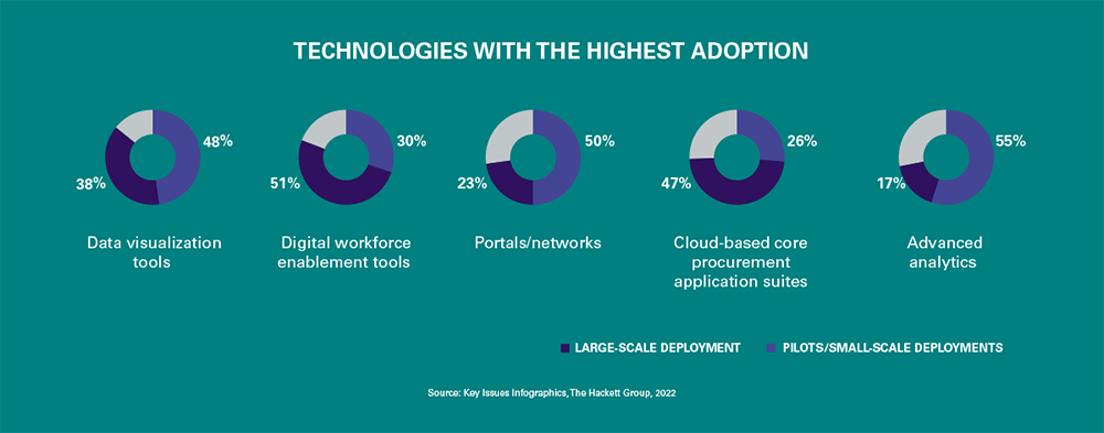 Digital workforce enablement and core procurement application suites (cloud-based and legacy) have the highest levels of large-scale adoption to this point, but data visualization and master data management tools are not far behind. The latter two, along with advanced analytics, are expected to be among the fastest-growing technologies in adoption in 2022. These projections reflect the recognition that data and analytics will be key to realizing procurement objectives. Digital operating models require a modern digital architecture, and the research shows that cloud-based core procurement application suites are replacing legacy applications at a rapid pace. These will also be among the fastest-growing technologies in 2022.