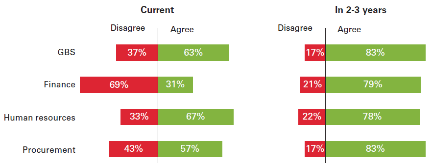 Apparently, this improvement has greatly bolstered the faith of business stakeholders. Eighty percent of them, on average predict that IT will achieve a partner status within the next two-to-three years. Of course, there are a few qualifiers here. It may be relatively easy to satisfy an HR organization by swapping out clunky legacy tools for a modern, cloud-based all-in-one suite. Finance, on the other hand, has no easy technology fix, which may be coloring their current perception. Yet, even finance leadership seems to have faith that IT will come through (see below).