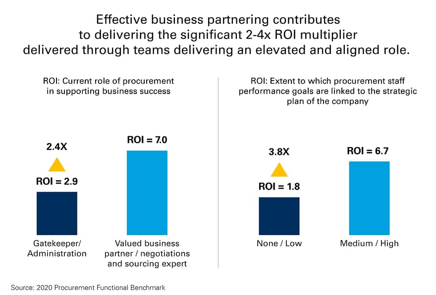 Procurement teams viewed as delivering a more strategic role as a “valued business partner” by internal business stakeholders report (2.4X) higher ROI than teams without. Teams with medium to high linkage of procurement performance goals to company strategy report (3.8X) higher ROI than other teams