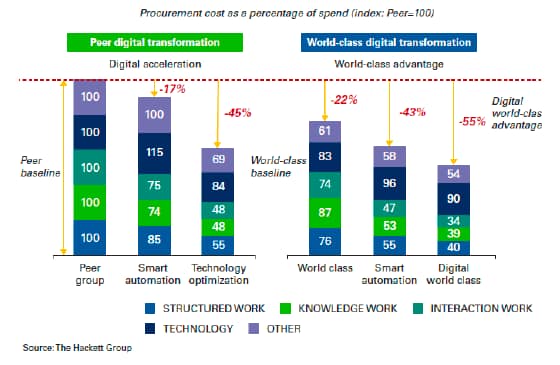 The Hackett Group’s research concluded that procurement organizations can reap significant benefits by taking a simpler interim approach. By deploying smart automation technologies such as robotic process automation, smart data capture, and cognitive automation, typical procurement organization should expect a 17% cost reduction, while world-class procurement organizations can reduce an already competitive cost structure by additional 21%.